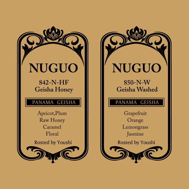 Nuguo Geisha 842-N-HF & 850-N-W Nuguo Geisha HoneyとWashed 14g を2個セット。9個 パナマ屈指の名園、フィンカヌグオのゲイシャハニーとWashed 一部のファンからは「ヌグオは栄養」とも評され、世界的にもなファンの多い農園です。複雑な旨味を感じるロットが多い印象。 ◇Nuguo Geisha 850-N-W ※404セットに入ってますのでご購入者様はお気をつけてください。 Flavor Grapefruit Orange Lemongrass Jasmine washed飲んで久しぶりにテンション爆あがりました。(というかヌグウォ初焼きだったけどうまいこと焼けてよかった) パナマ飲み慣れてくると、美味しいが日常になりすぎて「ああコンプレックスでいいよね」みたいな「知った顔」になることもなくもないのですが、これは本当に驚きがあってよかったです。フレーバーを書くと似たり寄ったりですが...うまく言い表せない良さを楽しんでほしい!! しくきれいなwashedが飲みたい方はマストバイ!です。 ◇Nuguo Geisha 842-N-HF Apricot,Plum,Raw Honey,Caramel, Floral うちのHoneyはとってもフルーティです。 香りがちょっと独特だけど、爽やかに甘くて複雑。こちらもとても美味しいのでおすすめ。 Nuguoにしかない複雑な美味しさをお楽しみください === 2021年度世界最高峰の品評会、Best of PanamaのGeisha Natural部門で優勝、Geisha Washed部門で準優勝した農園 世界中にコアなファンがいる一方、年間生産量が数百キロと少なく、入手困難な農園です。 Country: Panama Area: Renacimiento Farm: Nuguo Altitude: 1750-1950m Variety: Geisha Proceess: Honey,Washed